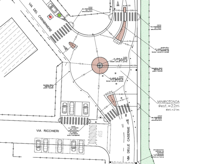 Al via i lavori per realizzare una minirotonda all’incrocio con via del Carabiniere, in posizione decentrata rispetto alla traiettoria su via delle Caserme, allo scopo di far rallentare le auto in vista degli incroci successivi di via dell’Aviere e viale Grigoletti.