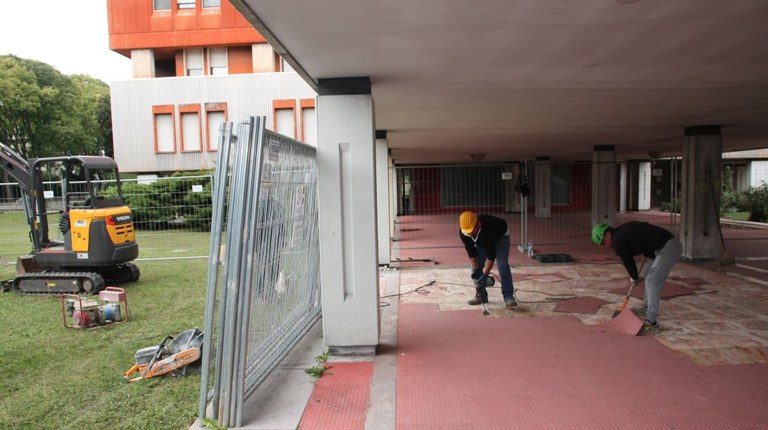 In particolare i lavori si concentrano sulla parte del porticato coperto pedonale con la pavimentazione in quadrotti di gomma, che ora vengono rimossi perché alcuni sono staccati ed altri presentano punti di rigonfiamento. In sostituzione verrà quindi stesa una guaina e una nuova copertura.